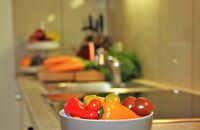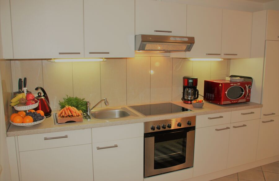 Küche: Esstisch mit zwei Stühlen, Backofen, Herd mit Cerankochfeld (keine Induktion), Geschirrspüler, Kühlschrank mit Gefrierfach, Kaffeemaschine, Wasserkocher, Toaster, Mikrowelle, Eierkocher