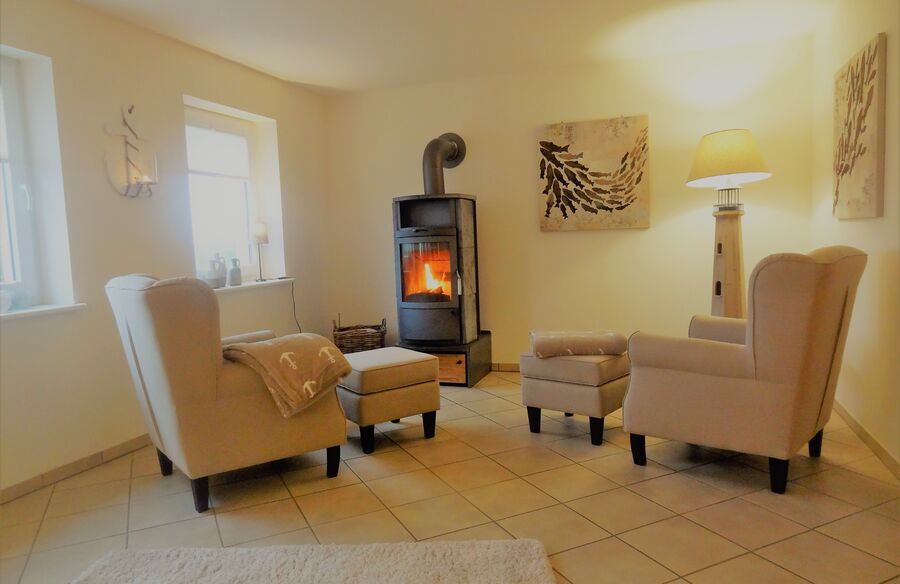 Wohn- und Esszimmerbereich: großer Esstisch mit vier Stühlen, zwei gemütliche Ohrensessel mit Fußablage-Hocker, Brennofen, Fußbodenheizung