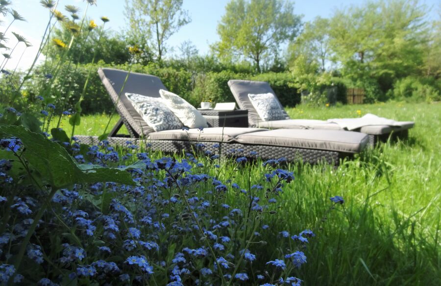 Ca. 500 qm Gartengrundstück mit Liegewiese, Sonnenliegen, Sonnenschirm und Holzkohlegrill, kostenloses WLAN, zwei PKW-Parkplätze am Haus, abschließbares Nebengebäude