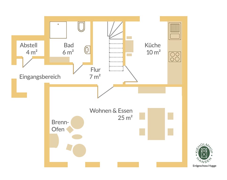 Erdgeschoss: großes kombiniertes Wohn- und Esszimmer mit Fußbodenheizung und Brennofen, moderne Einbauküche, harmonisch in Naturtönen gehaltenes Duschbad, Abstellraum (Flügelwäscheständer, Bügelbrett, Bügeleisen)